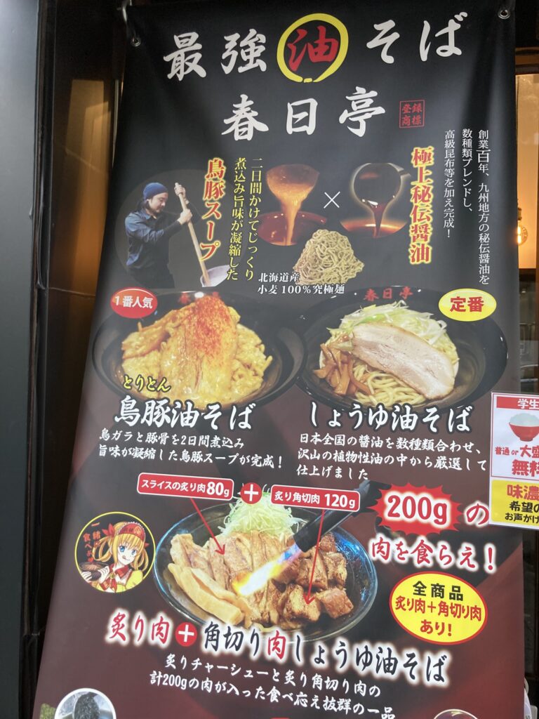 「鳥豚油そば」「しょうゆ油そば」など定番メニューに加え、麺量の選択肢が豊富で“並盛〜最強盛まで”ガッツリ食べたい人にもぴったり。