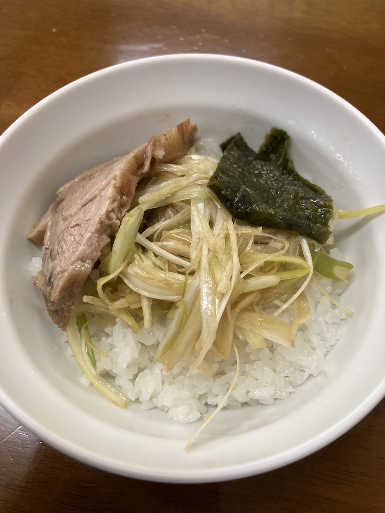 ラーメンの具材を乗っけて自家製ねぎチャーシュー丼を作成して食べるのも、ラーショならではか。