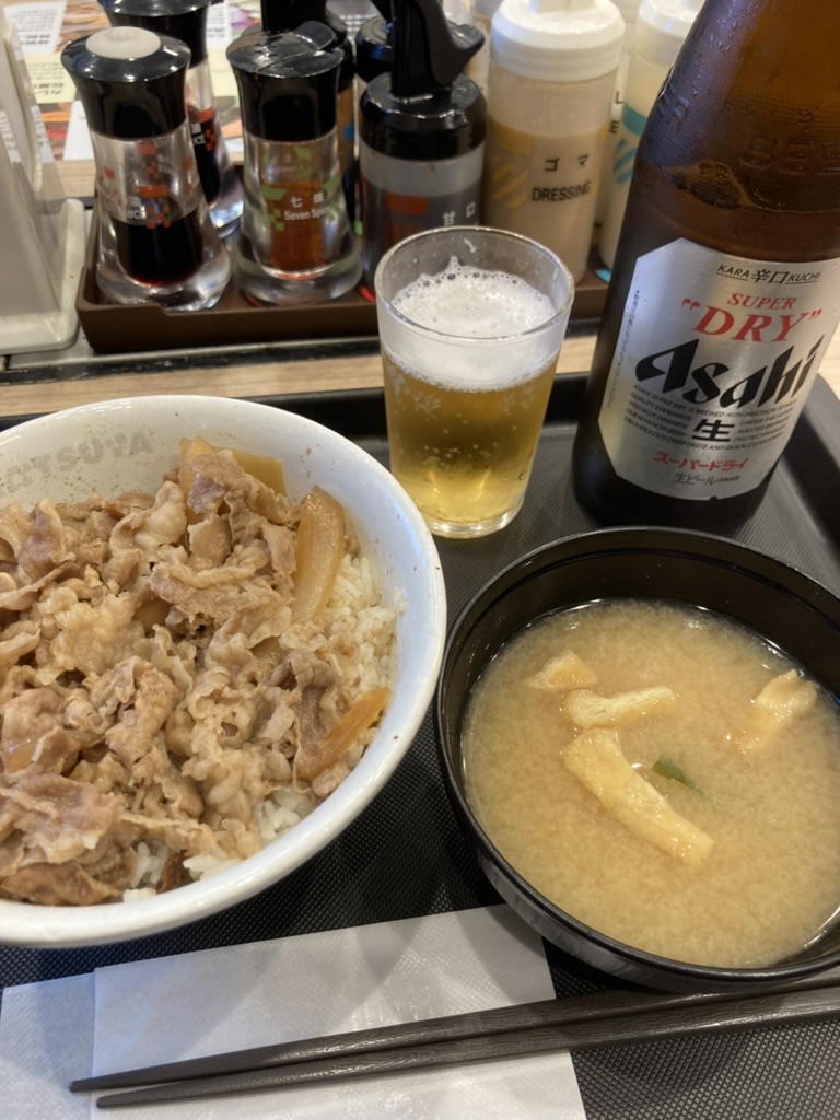 とにかく朝からビール目指していたので、食事シンプルに「牛めし」を選択しました。