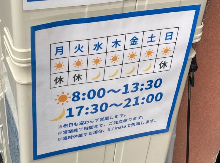 営業時間:8時〜13時半まで、夜は17時半〜21時まで(日月火は昼のみ)